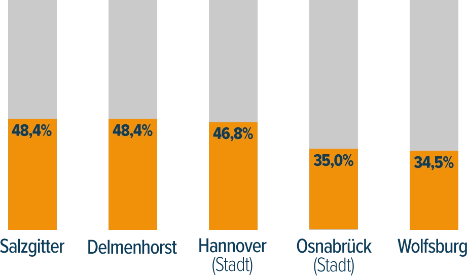 Im landesweiten Vergleich stechen vor allem einige Städte hervor: In Salzgitter und Delmenhorst liegt der Anteil bei 48,4 %, in Hannover (Stadt) bei 46,8 %. Damit ist die Minderheit dort bereits fast in der Mehrheit.